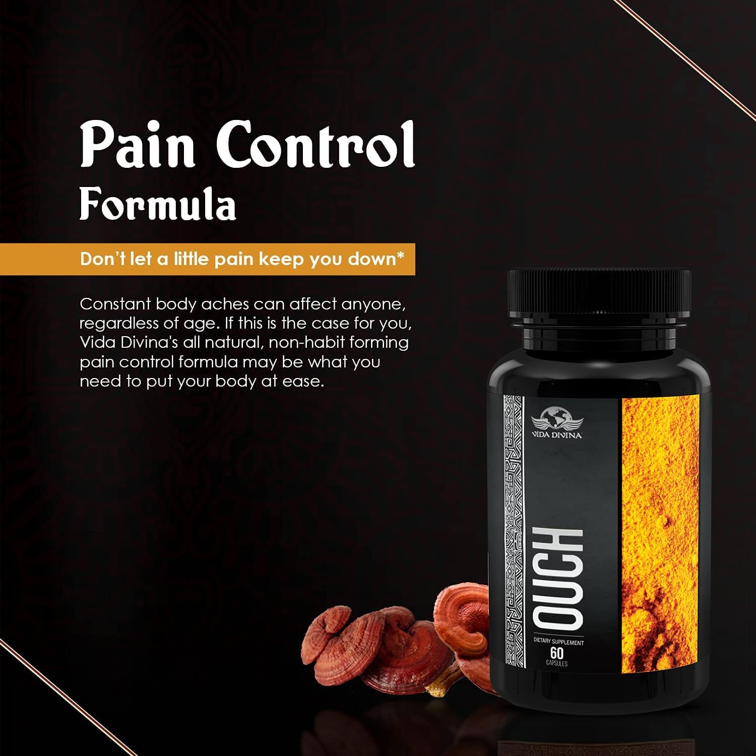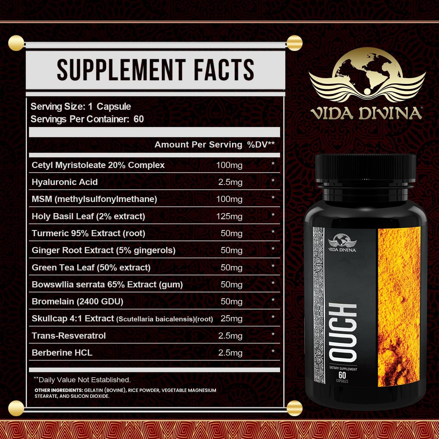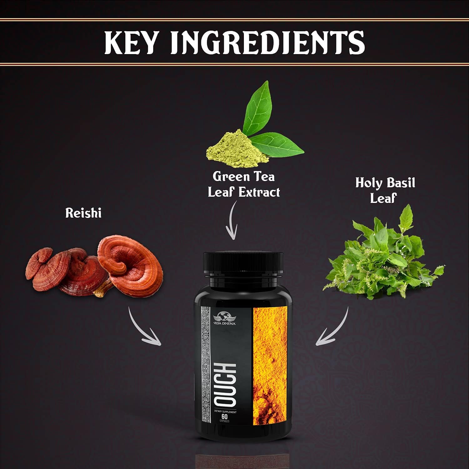 - La mezcla patentada de hierbas naturales de Vida Divina Ouch Capsules, como el reishi orgánico y la hoja de albahaca sagrada, tiene propiedades antioxidantes para brindar apoyo adicional a las articulaciones.