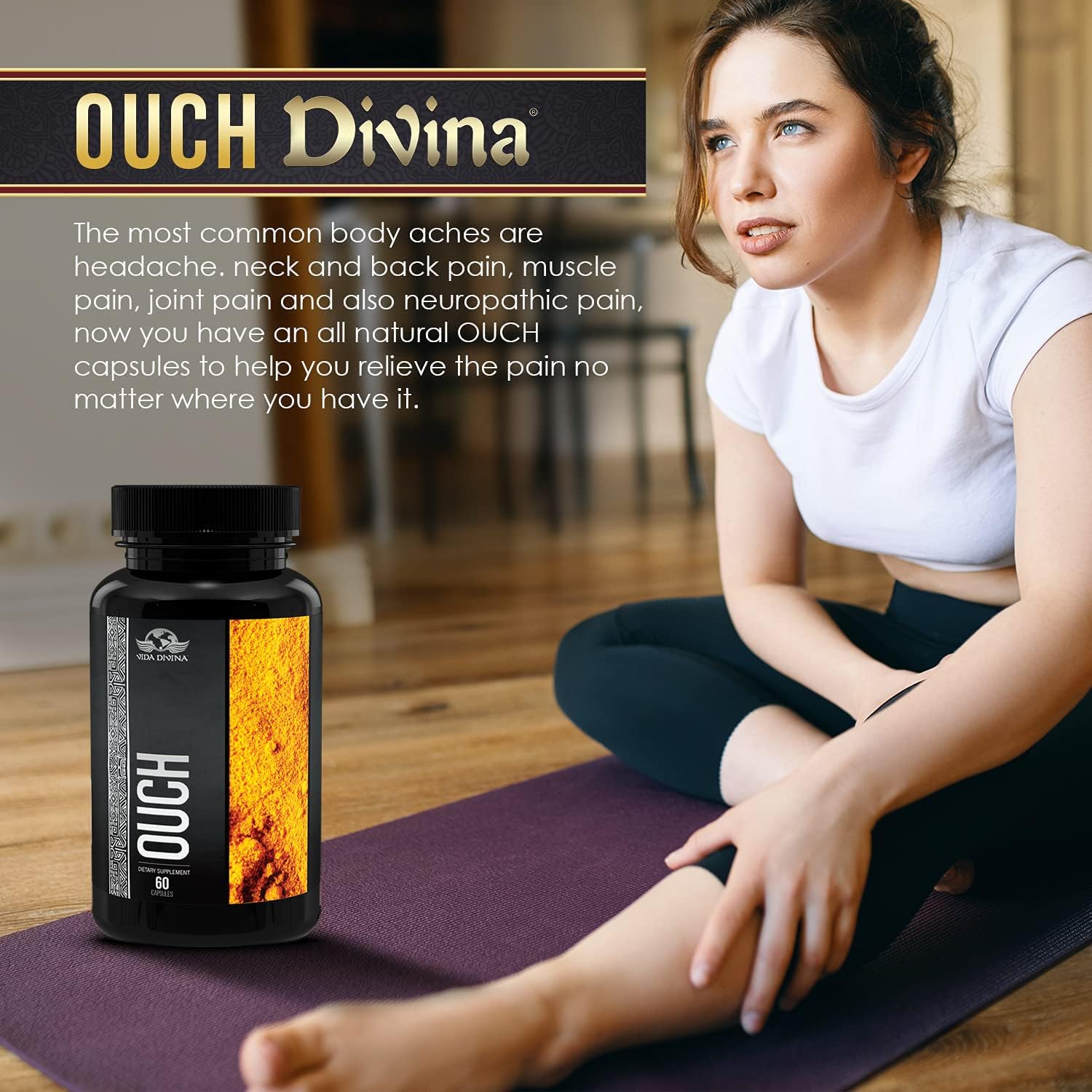 - Las cápsulas Vida Divina Ouch ayudan a aliviar el dolor articular y respaldan la salud, la flexibilidad y la movilidad general de las articulaciones.